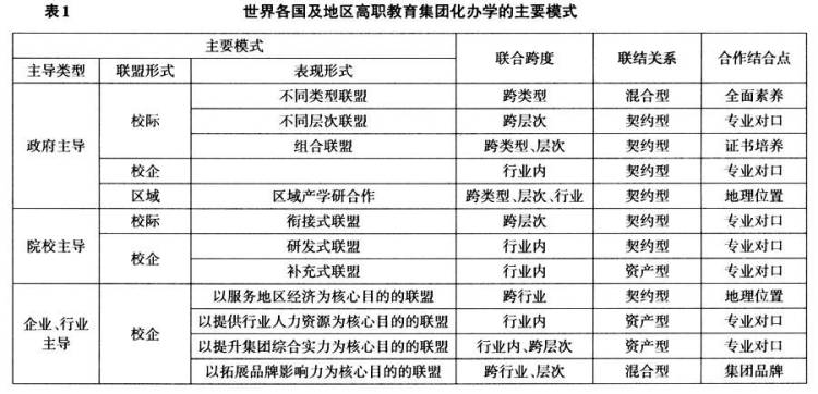 国外高职教育集团化办学模式有政府主导型、院校主导型、企业主导型、校校模式、校企模式、综合模式、自愿联盟模式等。国内高职教育集团化办学模式主要有政府主导型、滚动发展型、产业支撑型、校企合作型、校校合作型等(如表1所示)。从世界各国办学的模式与主体来看,各国都结合世界办学的经验与自己国情,创建各种模式,显现出多元化的特征。